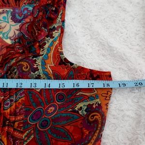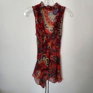 This is a lightweight, sleeveless, gorgeous top I believe in medium, no tags present. Vibrant bohemian orange paisley print with ruffled neckline and shark bite hem. The garment tag photo has been pulled from another post, just to show brand and fabric content.
