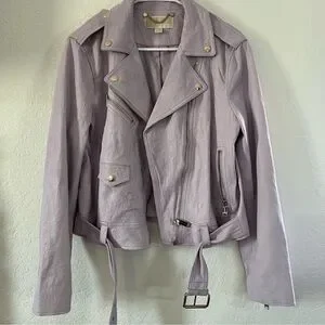 Stylish light purple leather jacket. Features gold-tone hardware and zip details. Perfect for a trendy look.