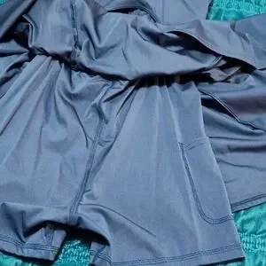 Stylish blue mini dress. Features shorts underneath with a pocket and removable bra pads. Perfect for casual outings.