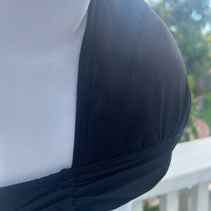 This sleek black bikini from Bird by Juicy Couture features a halter-style top with a deep V-neck and a subtle decorative clasp. The minimalist design and solid color make it a timeless choice for any swim occasion.