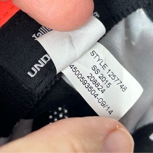 Under Armour Black Camo Neon Orange Logo & Piping OSFA. Hard bill, velcro adjustable strap, 88% polyester. Style 1257748. Pre-owned in good condition.