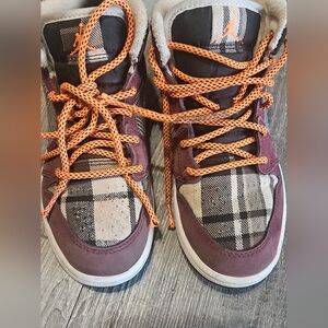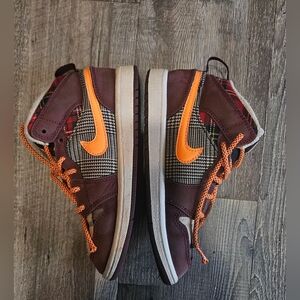The product is a pair of Air Jordan sneakers in size 1Y, featuring a stylish plaid pattern in burgundy and orange colors. These mid-top shoes are designed for boys and have a lace-up closure for a secure fit. Part of the Air Jordan Retro product line, these athletic sneakers are a fashionable and comfortable choice for young boys who love basketball or simply want to showcase their sneaker style. Perfect for everyday wear or special occasions, these Air Jordan PLAID shoes are sure to make a statement.