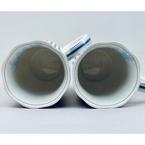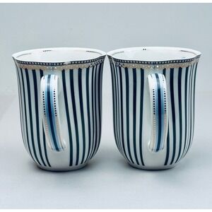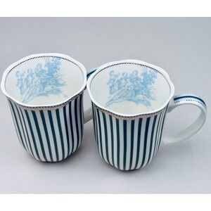 Elevate your morning ritual with this exquisite set of two Grace Teaware fine porcelain mugs. Each mug showcases a sophisticated navy and white vertical stripe pattern, beautifully complemented by a delicate gold scalloped trim and a charming blue pastoral scene adorning the interior. The elegant handle design, accented with subtle blue and gold details, adds a touch of refined artistry. These mugs invite you to savor your favorite hot beverages in style, perfect for quiet mornings, afternoon tea gatherings, or sophisticated brunches.