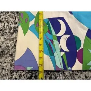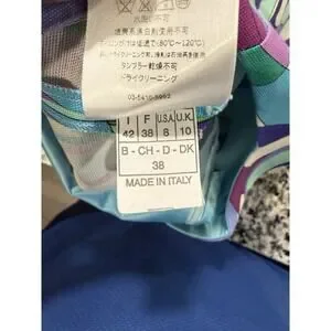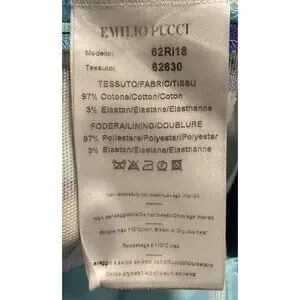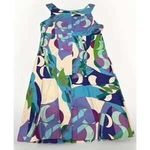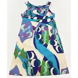 This Emilio Pucci multicolor abstract print knee-length dress is a stylish and unique piece perfect for a casual occasion. Made from a comfortable cotton blend material with a stretch feature, this sleeveless dress with a V-neckline offers a flattering A-Line silhouette. The vibrant multicolor pattern adds a fun and playful touch, making it a standout piece in any woman's wardrobe. Crafted in Italy by the prestigious brand Emilio Pucci, this dress exudes a chic and sophisticated vibe, ideal for the summer season.