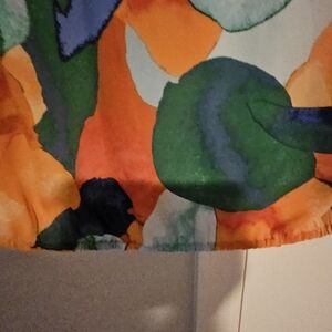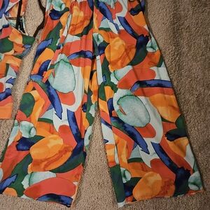 Dynamic design with bold patterns. Features orange, blue, and green hues. Polyester. Pants are lined. The top is not. Elastic waist on pants and shirt.