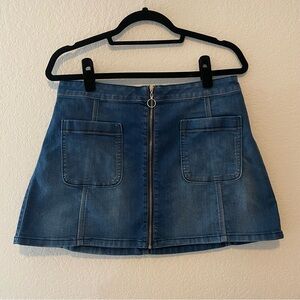 Pre-owned Hollister A-Line Mini Denim Skirt. Features a full-length frontal zipper closure and two frontal pockets. In excellent condition with no stains or tears.