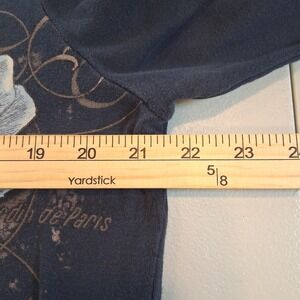 Charming top that captures a touch of vintage Parisian flair. This navy blue top is adorned with a detailed graphic featuring a cyclist motif, interspersed with delicate roses and embellished with subtle rhinestones for added sparkle. The flattering V-neckline, complemented by the 3/4 sleeves, makes it a versatile piece for any wardrobe. The design incorporates faded script and musical notes, evoking a sense of timeless elegance. Perfect for a casual brunch, a leisurely afternoon stroll, or a cozy evening at home, this top blends comfort with unique style.