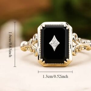 This elegant stimulated black onyx ring features a rhinestone in the center. Set in a luxurious gold band. Perfect for adding a touch of sophistication to any outfit.
