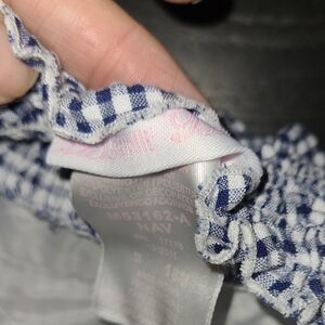 Adorable blue gingham dress with playful red bows. Ideal for a fun day out.