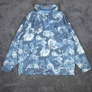 Nike Therma-FIT pullover fitness hoodie designed for cold-weather workouts and everyday wear, featuring a blue and white abstract ice-dye graphic.