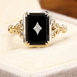 This elegant stimulated black onyx ring features a rhinestone in the center. Set in a luxurious gold band. Perfect for adding a touch of sophistication to any outfit.