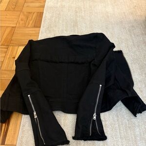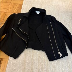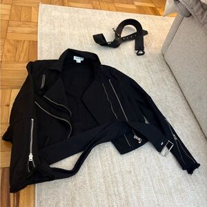 Chic black leather jacket with silver zippers. Includes a stylish belt for a tailored fit.