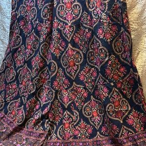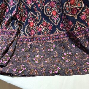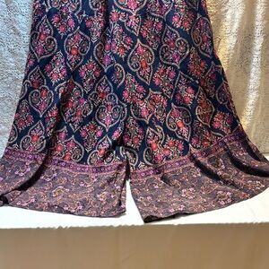 Stylish wide leg pants with a vibrant floral pattern. Features a navy base with pink accents. Comfortable and chic design.
