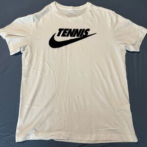Classic white Nike t-shirt. Bold black 'Tennis' logo on front. Casual and sporty.