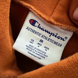 Cozy burnt orange hoodie. Features Champion logo. Perfect for casual wear.