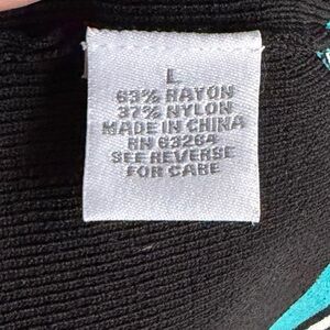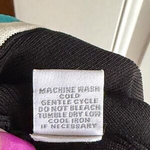 This is a classic one button cardigan from Dress Barn, ladies size Large. The knit, 63% rayon/37% nylon, is solid black with crisp teal and white contrast trim. Features a round neckline, three-quarter length sleeves, and a striped hem for a polished, tailored look. This versatile layering piece is a timeless design that pairs well with dresses, trousers, or jeans!