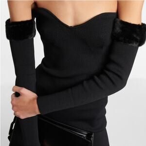 Introducing Josee, a new compact knit mini dress with sweetheart neckline. This style features off the shoulder sleeves with faux fur trim details.