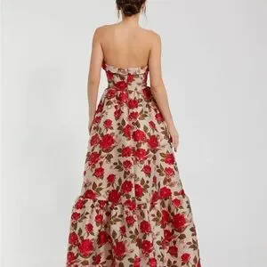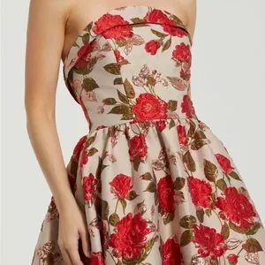 Website Description: Expertly crafted from luxurious brocade fabric, this strapless floral gown is the epitome of elegance. Its ruffled hemline and sleeveless design add a touch of femininity, making it the perfect choice for formal events. With its timeless silhouette and exquisite details, this gown is sure to make a statement.