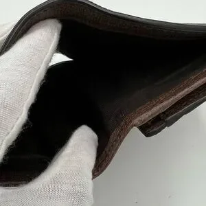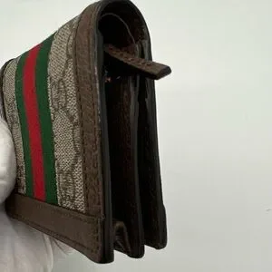 Stylish Gucci wallet featuring a brown and beige pattern with a red and green stripe. Gold logo accent adds elegance.