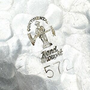 Trade Continental Mark vintage hand wrought hammered aluminum tray. decorative dish features a unique hammered texture across its surface, complemented by an engraved leaf pattern in the center. Three leaf-shaped feet elevate the tray. Some patina present from age.