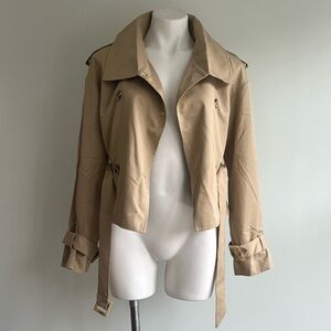 Clothing Details: Belted waist & cuffs, Tortoise shell buttons, Shoulder Epaulets