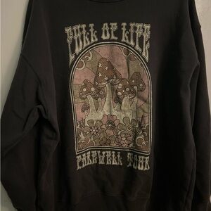 Cozy black sweatshirt with unique graphic design. Features artistic mushroom print. Ideal for casual wear.