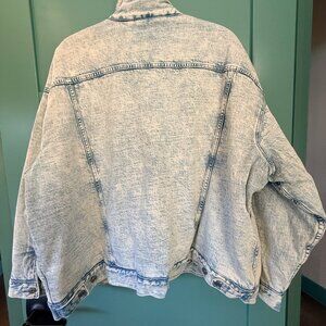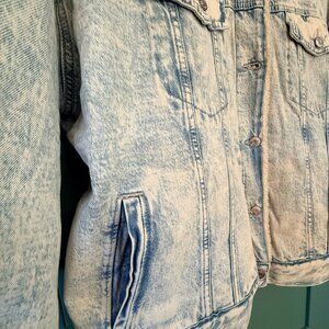 GAP denim jacket lined inside and collar with sherpa. Sleeves are quilted (see photo). 2 button down chest pockets and 2 front pockets. Size XXL and measurements are 29"armpit to armpit, 26"long, and 21.5 "sleeve. From a smoke-free home.