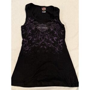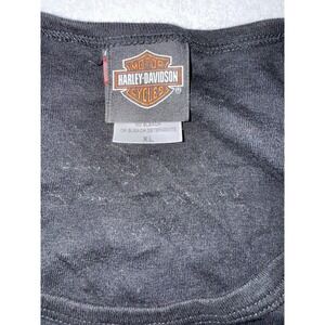This vintage women's Harley Davidson tank top in size XL features a black color with the iconic Harley-Davidson brand. The sleeveless design makes it perfect for warmer weather, and it is ideal for those who love riding motorcycles or are fans of the brand. With a nod to the Black Hills and Sturgis, SD, this top is a rare and unique addition to any wardrobe, perfect for those who appreciate classic Harley-Davidson style.