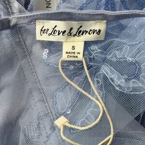 For Love & Lemons Presley Mini Dress in Periwinkle Blue. Size Small. Features sequin embroidered tulle, deep V neckline, long sleeves, tonal floral jacquard, corset with lace-up detail, keyhole at back, and invisible zip closure. Self: 90% polyester, 10% PET. Lining: 100% rayon. NWT / New with tags.
