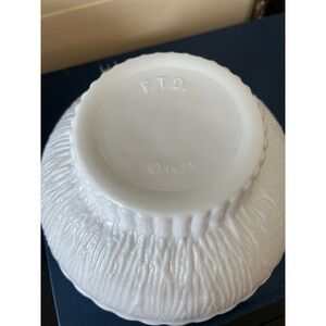 Vintage 1975 white milk glass bowl marked F.T.D. on the base. Features a beautiful bark-like textured exterior with a fluted pedestal-style base. Originally used by florists as part of a floral arrangement or centerpiece, this piece now works beautifully as a catchall bowl, display piece, or minimalist planter.