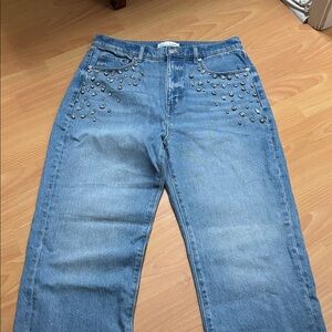 Chic light blue jeans with studded accents. Straight leg design. Ideal for casual outings.