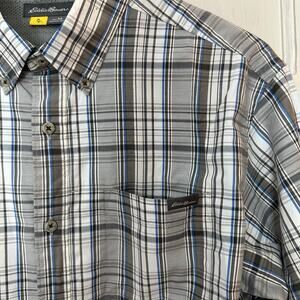 Eddie Bauer Travex Shirt Mens Medium Hiking Performance Gray White Blue Plaid Long Sleeve Logo Front Pocket Button Down
