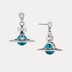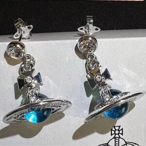 Vivienne Westwood Drop Orb Earrings Light blue Silver Stone with drawstring bag. MSRP $310