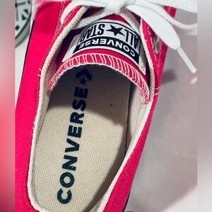 Bright pink Converse sneakers with classic white laces. These shoes feature a classic canvas upper and are elevated by a double-stacked rubber platform sole and an OrthoLite cushioned footbed for added comfort.