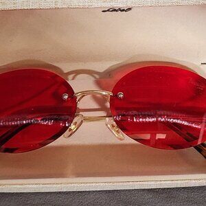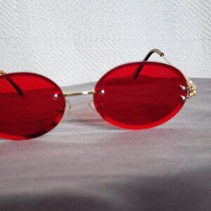 The Ventura Label Diamond Cut Ruby Red Oval Logo Engraved Gold Trim Sunglasses w/Linen Hard Cases.....Stunning in Appearance and even more Fashion Plate on the Face.....Beautifully Hand Made and very hard to find....Like Brand New.....