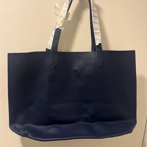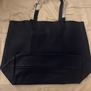 Cuyana pebbled leather tote in dark blue.