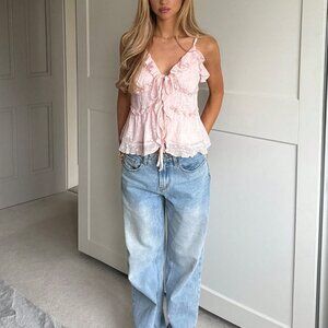 Pink Boho Women's Ruffled Tie Bow Lace Camisole