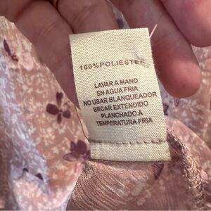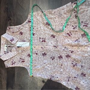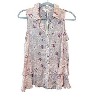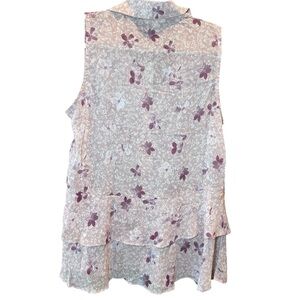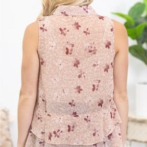 Charming floral blouse with button-up front. Sleeveless design, sheer. Soft pink and cream tones. Perfect for casual outings.