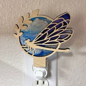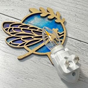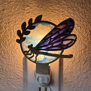 Keywords: dragonfly, nightlight, stained glass, wooden decor, plug in light, wall art, nature, insects, celestial, whimsical, ambient, bedroom, nursery