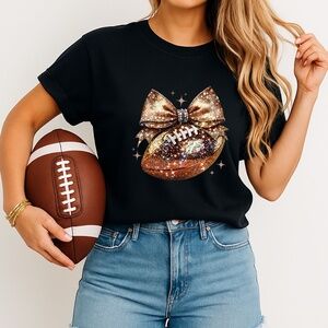 ๐ Sparkle & Spike: Gold Glitter Football Bow t-shirt. Touch down game ready