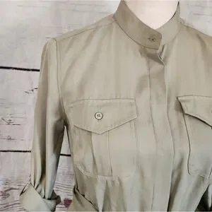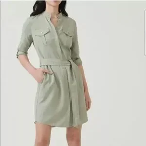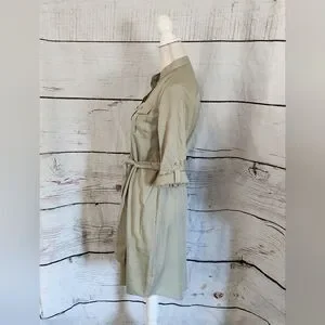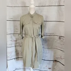 Sage green button front belted dress with roll tab sleeves and pockets. In great condition.