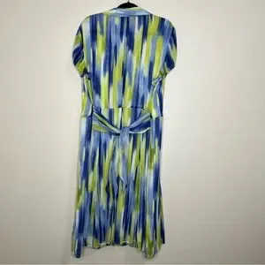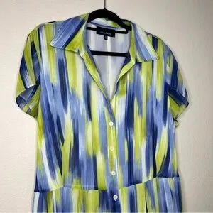 Stylish dress with a vibrant blue and green pattern. Features a button-down front and short sleeves. Perfect for casual outings.