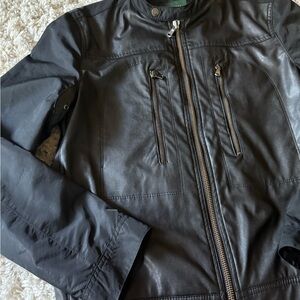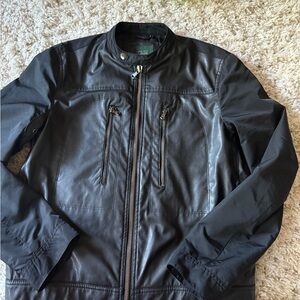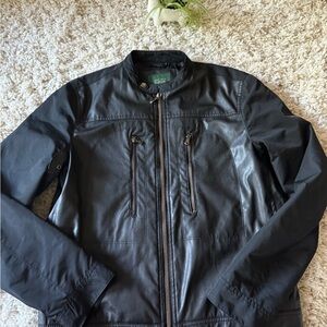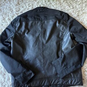 Stylish charcoal men’s Zara leather business jacket with sleek zippered pockets. Perfect for versatile layering.