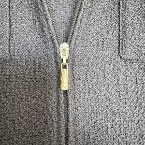 Classic Santana knit zip-front jacket with four front pockets and metallic accent trim. Iconic hammered metal zipper pull. Tailored silhouette with structured shoulders and soft stretch knit. High-quality textured fabric, perfect for professional wear or elevated fall/winter outfits.
