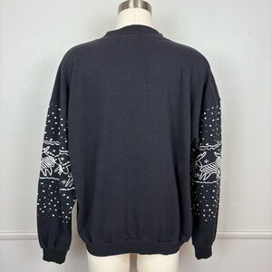 Caribe Sportswear Designed for Alaska Life Style. Vintage black sweatshirt features puffy print graphics in white with rows of reindeer, caribou, Eskimos, and polar bears across the front and also along the long sleeves. The Eskimos are holding a sign that spells out ALASKA. Trademark shows 1987. Banded waist and cuffs. Crew neck and dropped shoulders. Such a fun throwback piece!