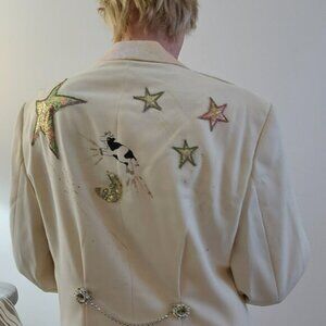 This cream colored jacket features amazing hand applied pearls, sequins, rhinestones, and paint, creating a one-of-a-kind look, perfect for holiday parties or other dress up occasions. It could also be worn with jeans for any occasion! The jacket is a men's dinner jacket in small, which fits my small frame (5'5", 116 lbs- size2-4).