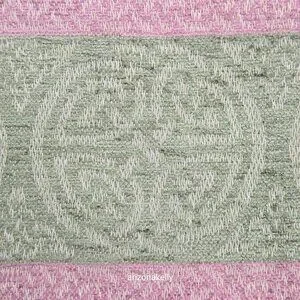 New with no flaws. Ivory colored scarf has an slightly embossed celtic design and at the ends there is a green and purple celtic knot design.