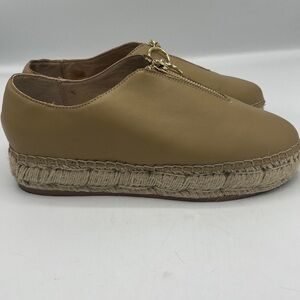 Stylish beige espadrilles with platform sole. Features a unique zipper design. Ideal for casual wear.