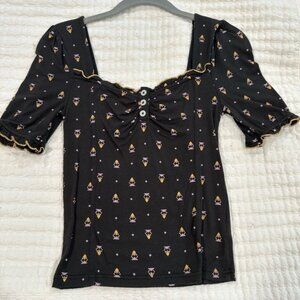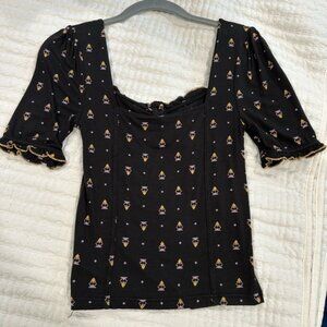 Chic black top with a delicate floral pattern, perfect for any occasion. Features a stylish square neckline and button details. Ideal for pairing with jeans or skirts. Only worn a couple of times. Like new condition.