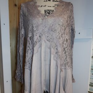 NWT Boutique item. Lace Tunic high-low blouse Top. Cream/Mocha color. This is a tunic length and too short to be worn as dress. Pair with a pair of leggings (check my boutique for the listing), or leather pants for a stylish look.